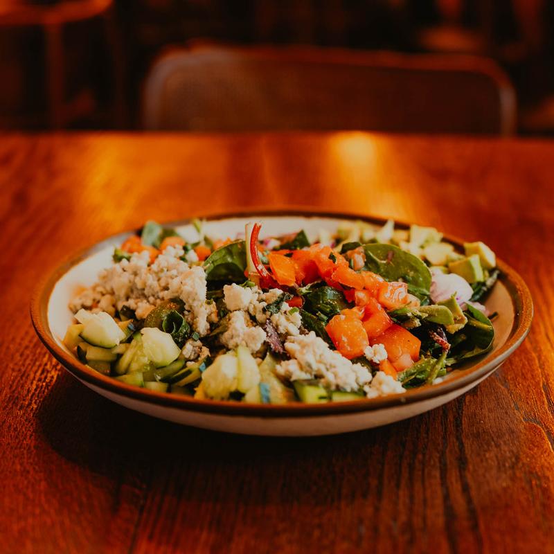 Shaved cucumber, tomatoes, onions, jalapeños, orange tahini dressing.