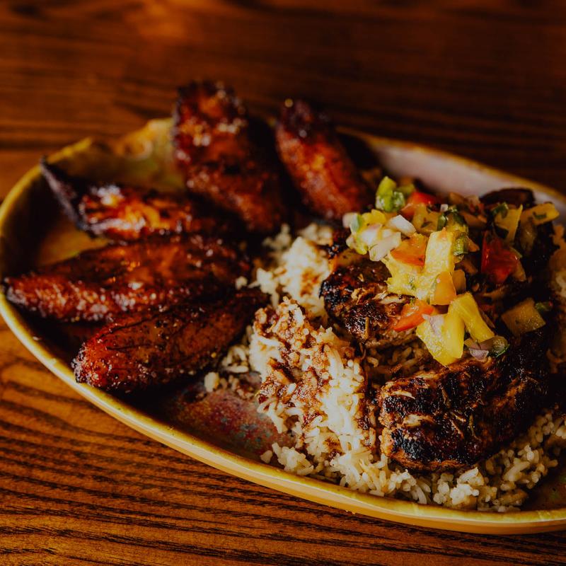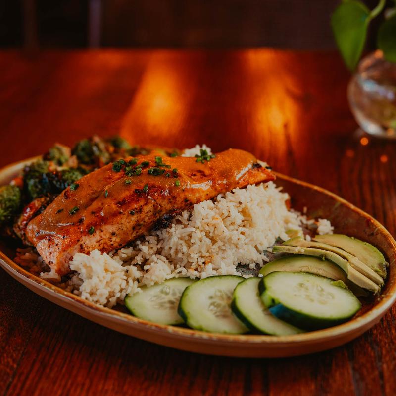 Grilled chicken, house rice, sliced avocado, pickled onions, roasted sweet potatoes, cucumbers, hot honey glaze.