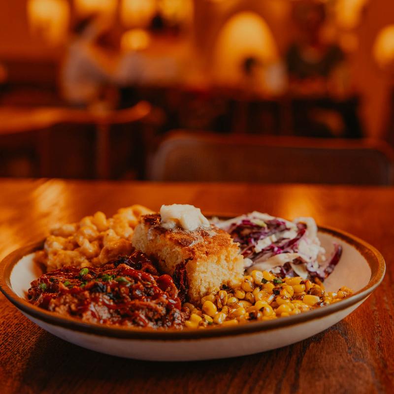 Shredded brisket, house bbq sauce, baked mac & cheese, roasted corn, red cabbage slaw.