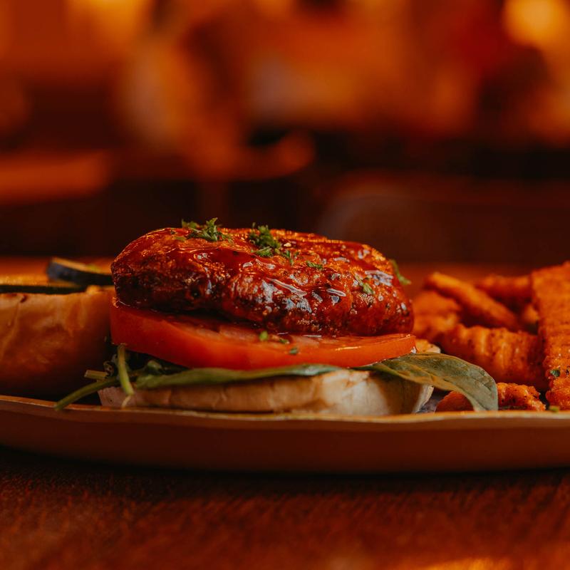 Charbroiled black-bean quinoa patty, caramelized onions, avocado, spring mix, tomatoes, house sweet cashew sriracha aioli.