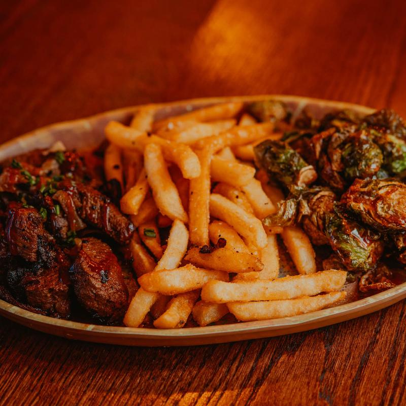 Pan seared beef tips, house rice, caramelized onions, Brussels sprouts.